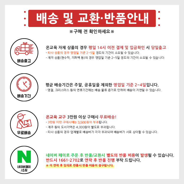 - 네이버페이 결제 건의 경우 임의로 반품 진행시 추가 반품비용이 발생될 수 있으니 반드시 고객센터와 연락후 반품부탁드립니다.(임의 반품시 추가비용은 별도 청구됩니다.)